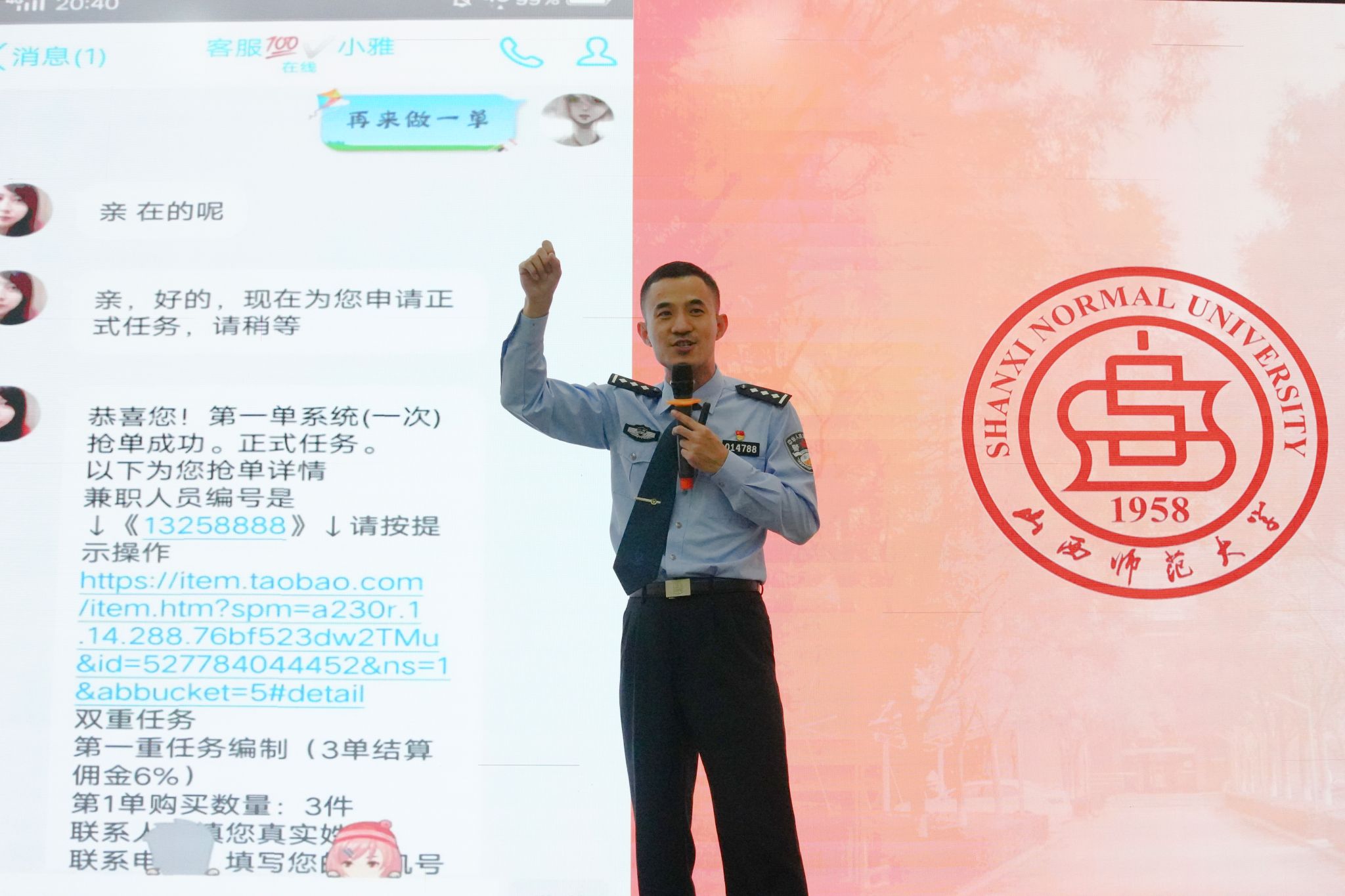 在讲座中,王警官以近期太原市高校频发的电信网络诈骗案件为切入点,采用“以案释法”的形式,讲解了常见的诈骗手段,提醒师生切勿轻信“低门槛高回报”“公检法保密转账”等诱导性话术,务必做到“不轻信、不透露、不转账”。在普及反诈知识的同时,王警官还引用了近期境外间谍组织通过社交媒体诱骗高校员工窃取涉密信息的真实案例,警示师生警惕网络交友中的“糖衣炮弹”。他强调要严守学术科研数据、军事设施信息等国家机密,并鼓励师生主动举报可疑线索,共同织密国家安全防护网。