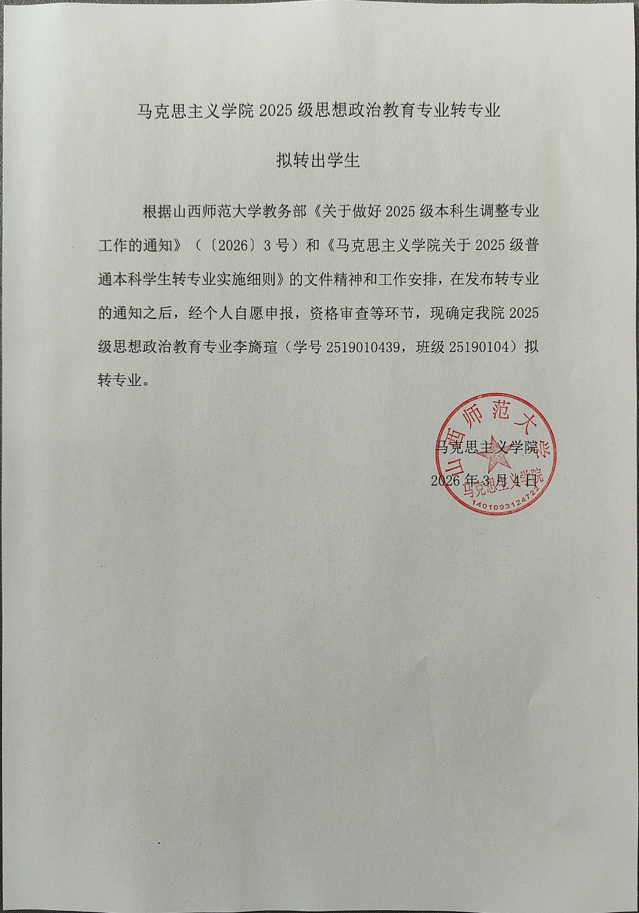 太阳成集团tyc122cc2025级思想政治教育专业转专业拟转出员工